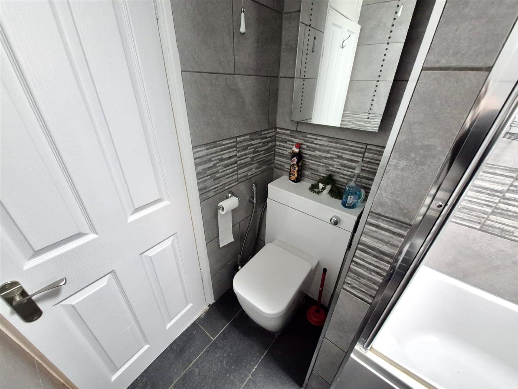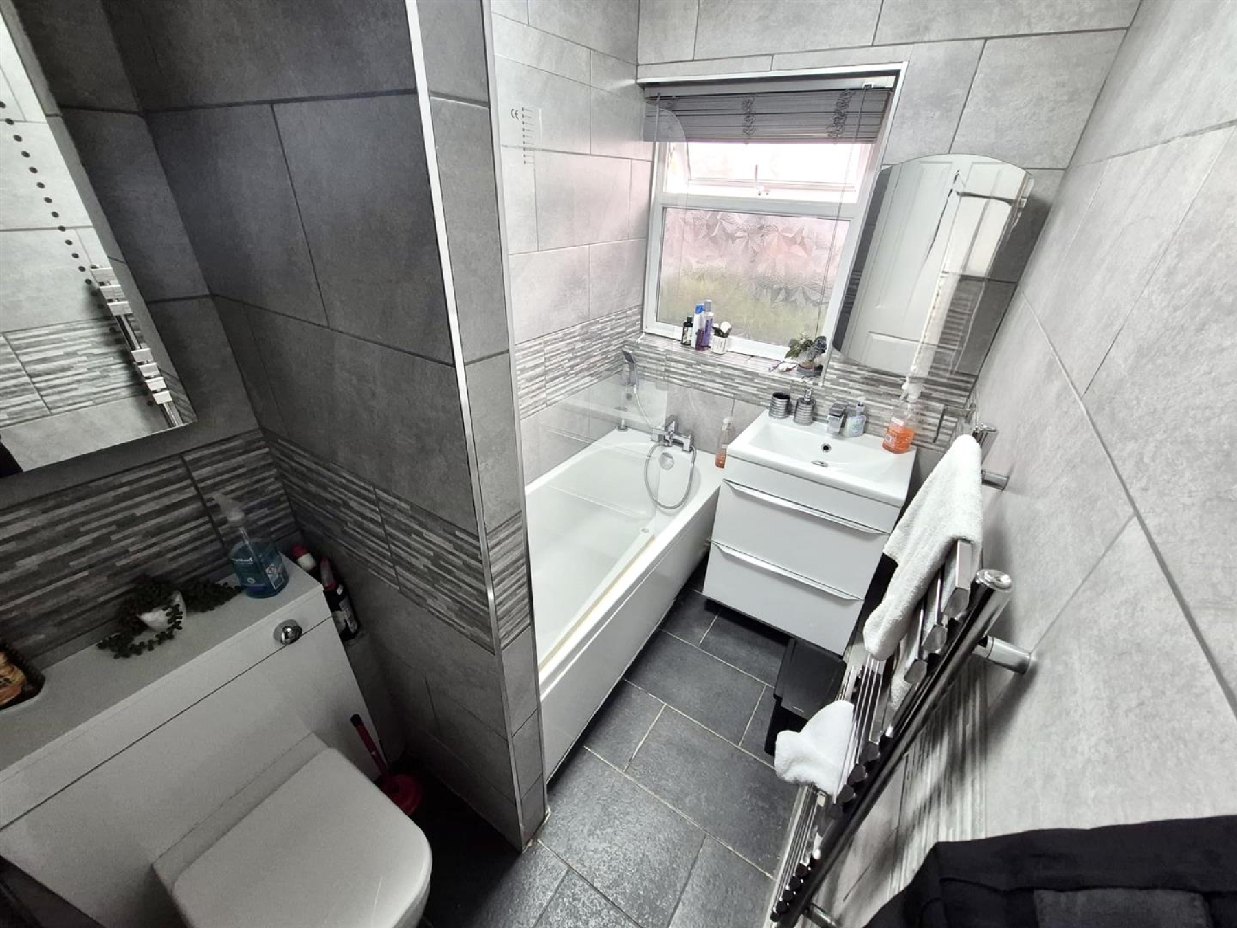 Bathroom - 1.47 x 2.42 (4'9" x 7'11") - Double glazed window, chrome towel rail, tiled flooring and walls, white suite which features a panel bath with shower-mixer unit on the taps and shower screen, low level W.C and pedestal wash basin.
