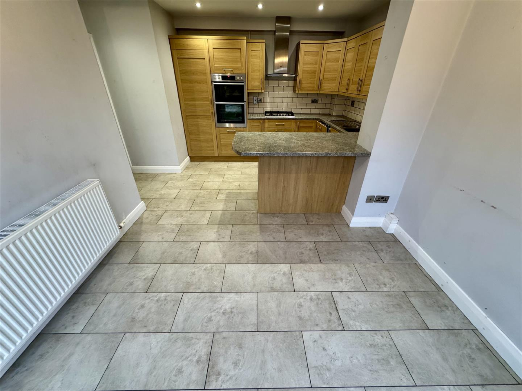 Kitchen/Dining Room - 5.072 x 4.045 (16'7" x 13'3") - Extended and recently refurbished kitchen/dining room. The kitchen has matching wooden wall and base units, worktops, breakfast bar, intergrated fridge/freezer, dishwasher, electric oven and grill, gas hob, extractor fan and a space for a washing machine, inset one and half sink with mixer tap and tiled splashbacks. Tiled floor, double central heating radiator, velux window and bifold doors leading into the garden.