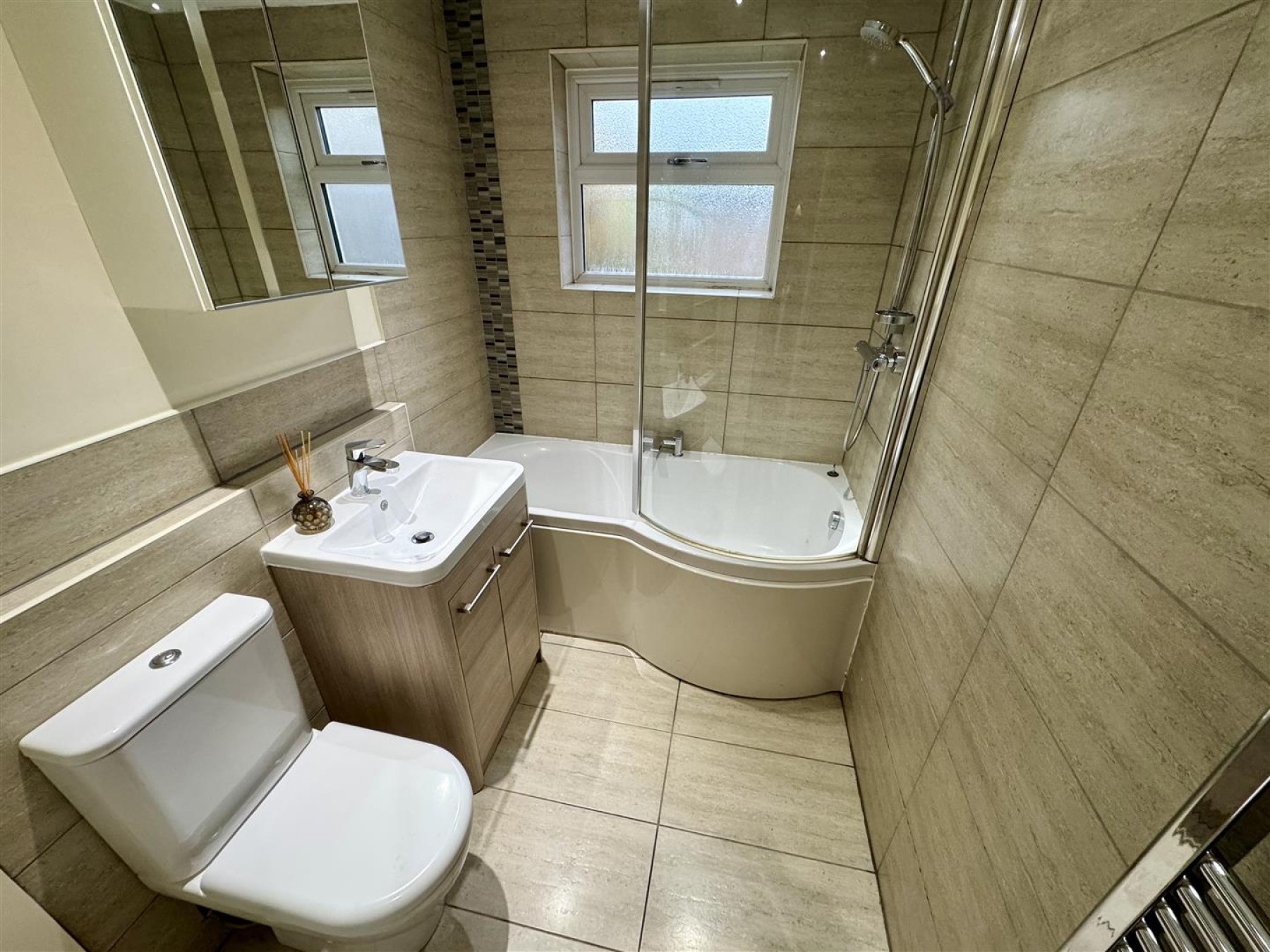 Family Bathroom - 2.725 x 1.665 (8'11" x 5'5") - Fitted with a white suite which features a p-shaped bath with a mixer shower over and shower screen, close coupled W.C and vanity sink unit. This half tiled bathroom benefits from a heated towel rail, spotlights, double glazed windor to the rear aspect and tiled flooring.