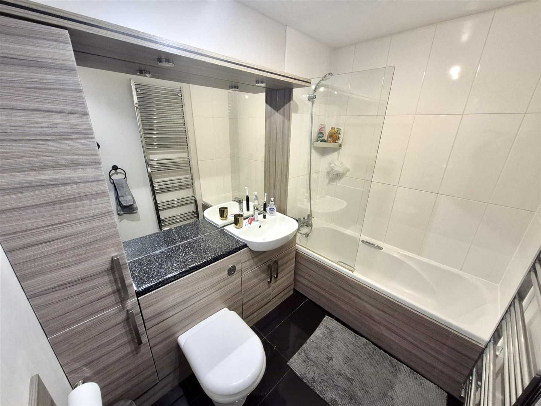 Bathroom - 1.54 x 2.04 (5'0" x 6'8") - Chrome towel rail, tiled flooring and walls, white suite which features a panel bath with shower-mixer unit on the taps and shower screen, vanity unit with close couple W.C and pedestal wash basin.