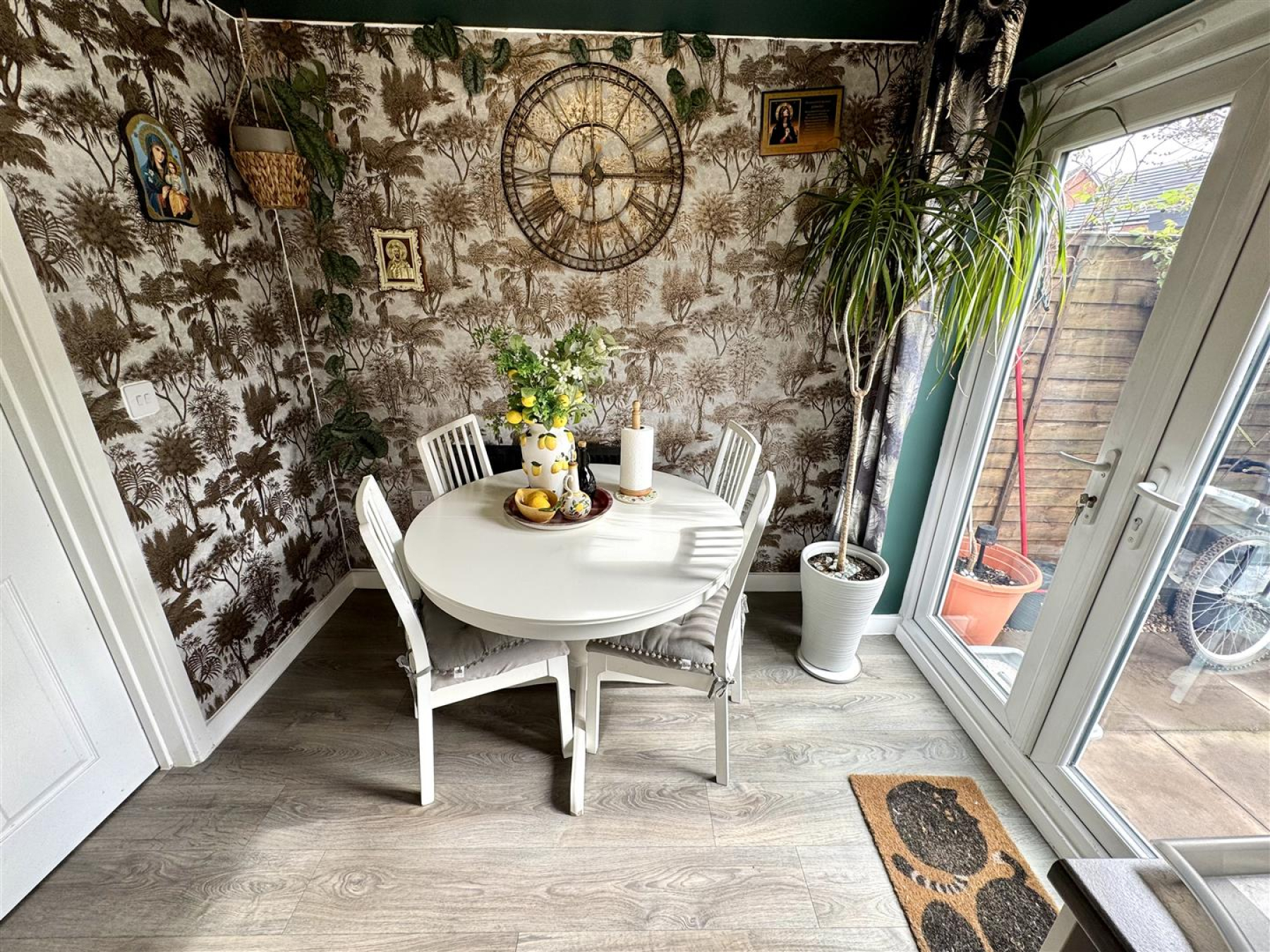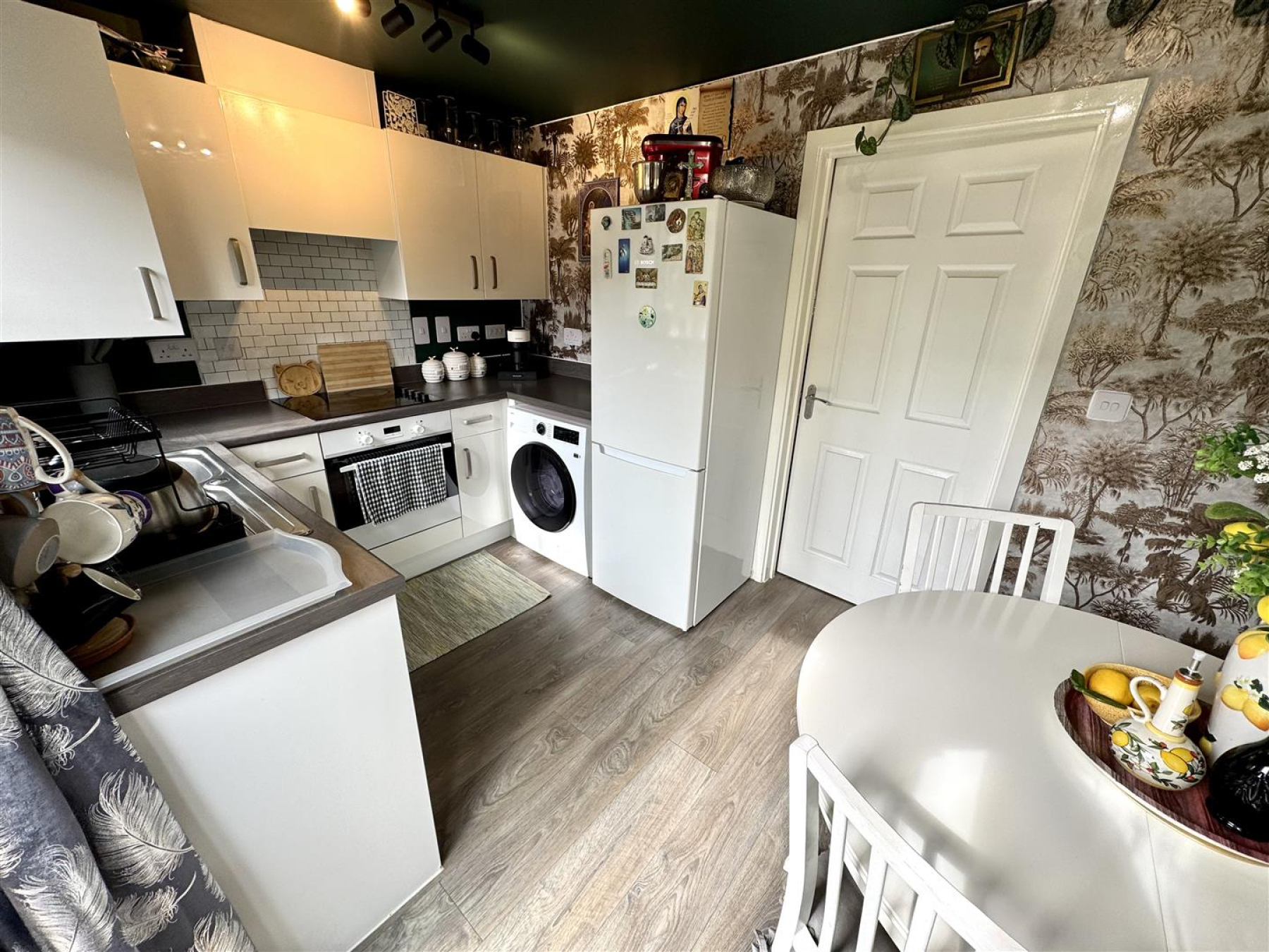Kitchen/Dining Room - 3.822 x 2.474 (12'6" x 8'1") - Fitted with matching high gloss wall and base units including cupboards and drawers, built in electric hob and oven with cooker hood, inset one and a half bowl stainless steel sink unit with mixer taps, roll top work surfaces with tiled splash back areas, with space for upright fridge freezer along with plumbing for washing machine and dishwasher, finished with laminate flooring. Double glazed window to the rear aspect and French doors leading into the garden.